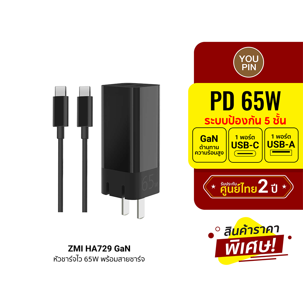 [ราคาพิเศษ] ZMI HA729 Gan 65W ขนาดเล็ก จ่ายไฟแรง อุณหภูมิต่ำ หัวชาร์จ รับประกันศูนย์ไทย -2Y