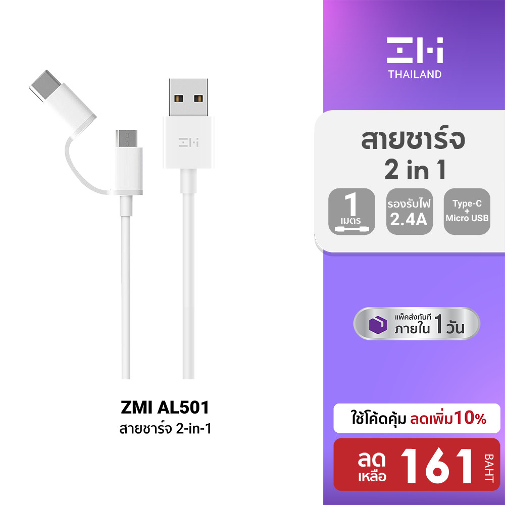 [ลดเหลือ 161] ZMI (AL501) สายชาร์จ 2-in-1 (Type-C + Micro) ยาว 1 ม.จ่ายไฟแรงเสถียร