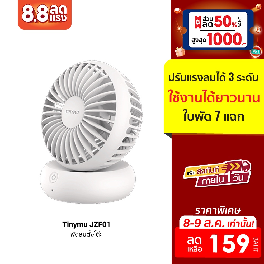[159 ดูโค้ดรูป 2] Tinymu JZF01 พัดลมตั้งโต๊ะ พัดลมไร้สาย แหงนขึ้น-ลงได้ ปรับแรงลมได้ 3 ระดับ ลมแรง -7D |