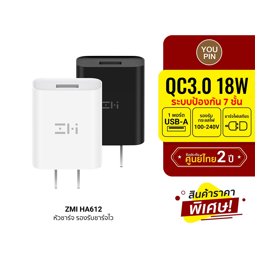 [ราคาพิเศษ] ZMI HA612 หัวชาร์จ พอร์ต USB-A จ่ายไฟ 18W รองรับเทคโนโลยี Quick Charge 3.0 ศูนย์ไทย -2Y |
