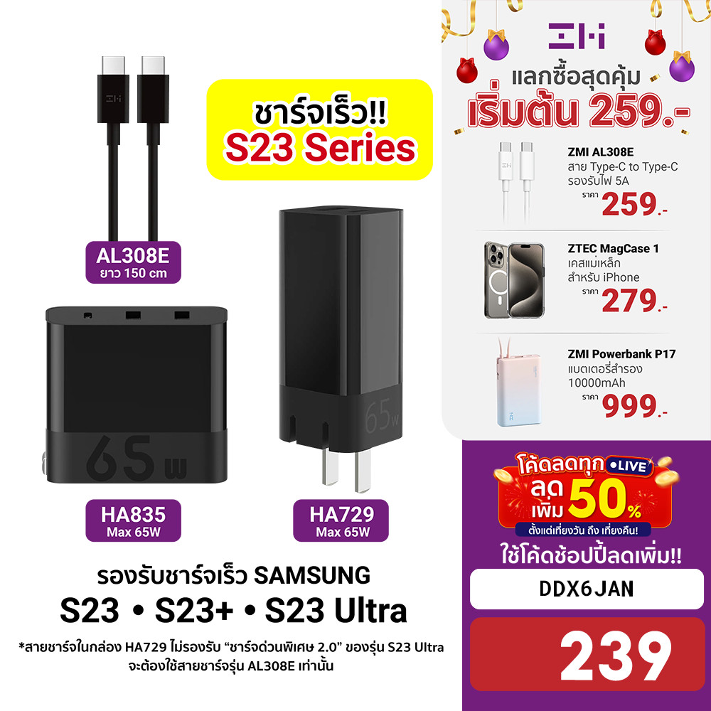[799บ.โค้ด20DDX125] ZMI HA729 Gan 65W (พร้อมสาย USB-C 1.5M) ไฟแรง อุณหภูมิต่ำ หัวชาร์จ-2Y