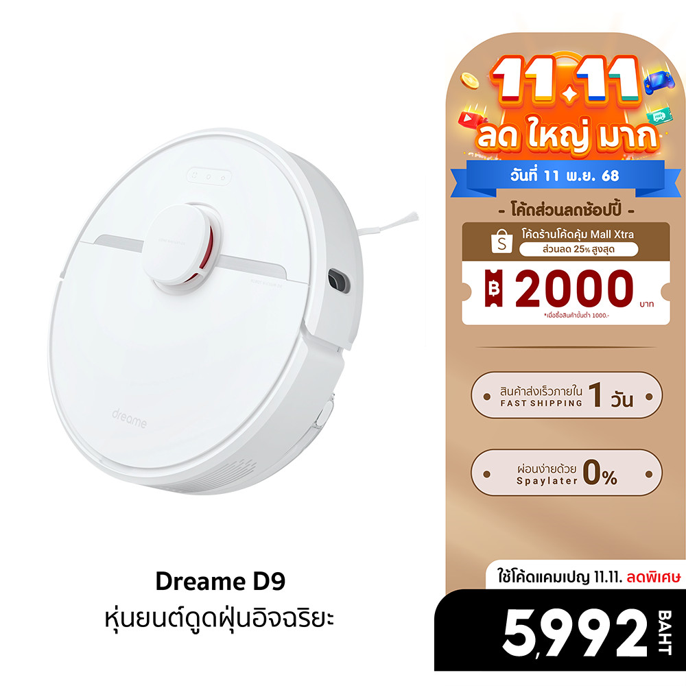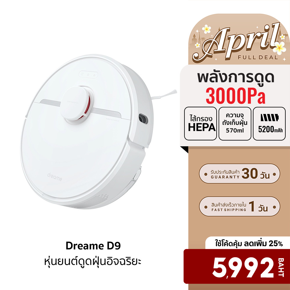 [ลดเหลือ 5992] Dreame D9 หุ่นยนต์ดูดฝุ่นอิจฉริยะ พลังการดูด 3,000Pa สามารถดูดฝุ่นได้หมดจด -30D