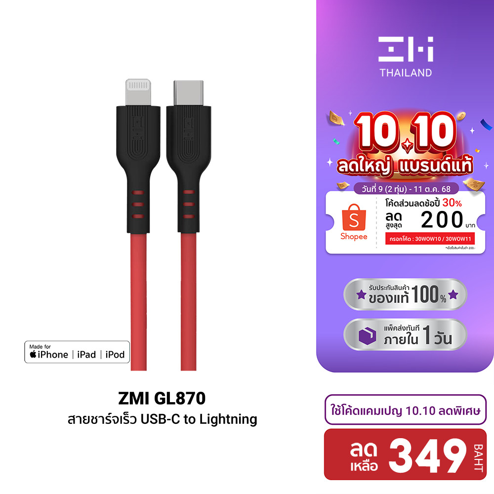 [ลดเหลือ 349] ZMI GL870 สายชาร์จเร็ว Premium สำหรับ iPhone มาตรฐาน MFI ยาว 1 เมตร -2Y