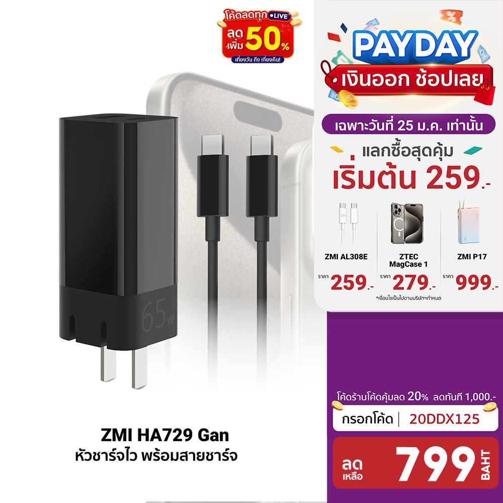 [799บ.โค้ด20DDX125] ZMI HA729 Gan 65W (พร้อมสาย USB-C 1.5M) ไฟแรง อุณหภูมิต่ำ หัวชาร์จ-2Y |