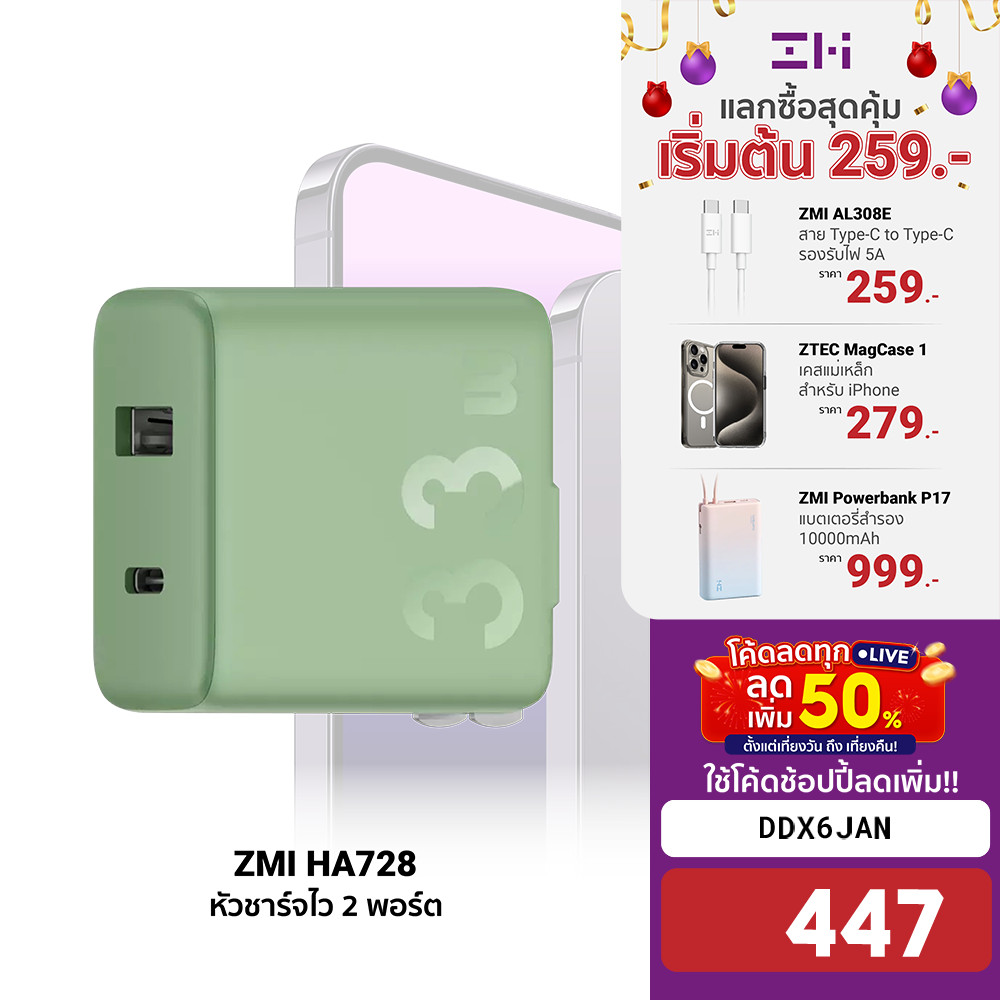 [447บ.โค้ดDDX6JAN] ZMI HA728 Adapter 33W หัวชาร์จ 2 พอร์ต ชาร์จไวสำหรับ iPhone Samsung พร้อมส่ง -2Y |