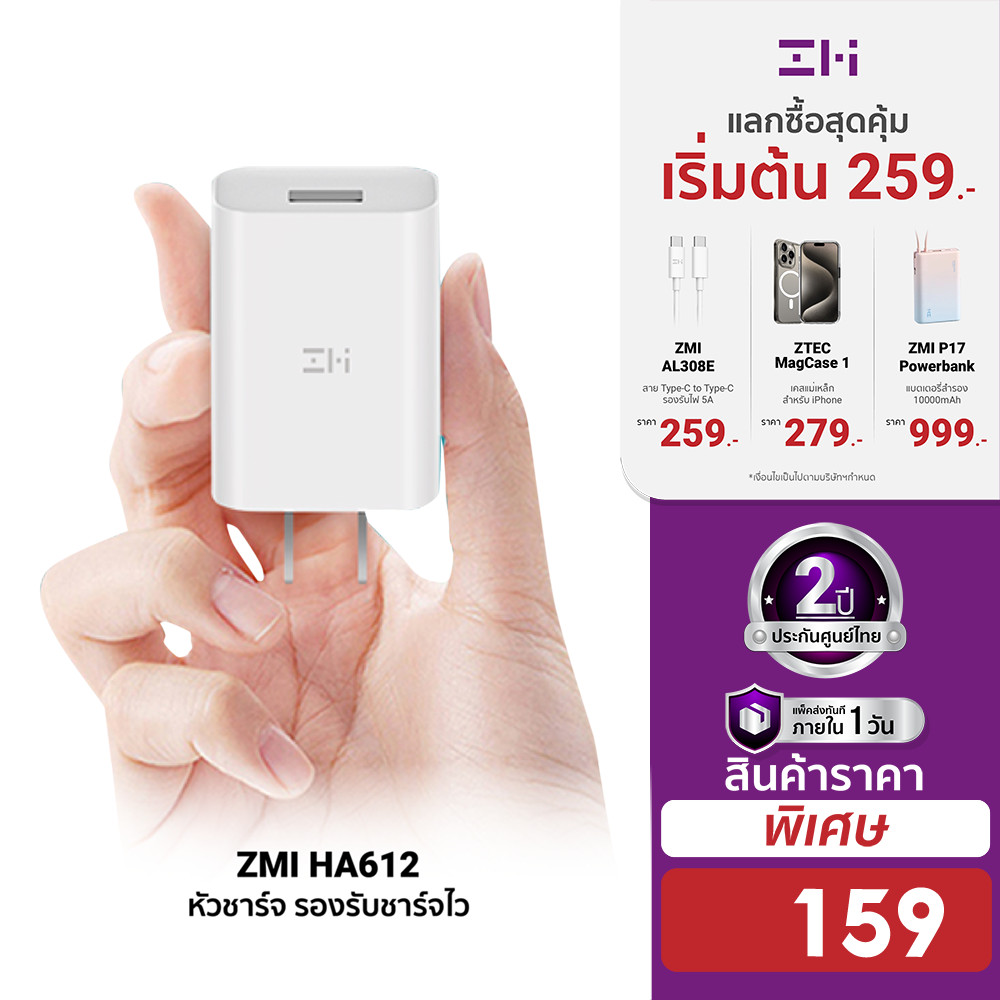 [179บ.โค้ดDDX10MAYW4] ZMI HA612 หัวชาร์จ 18W รองรับชาร์จไว QC3.0 ศูนย์ไทย ประกัน -2Y |