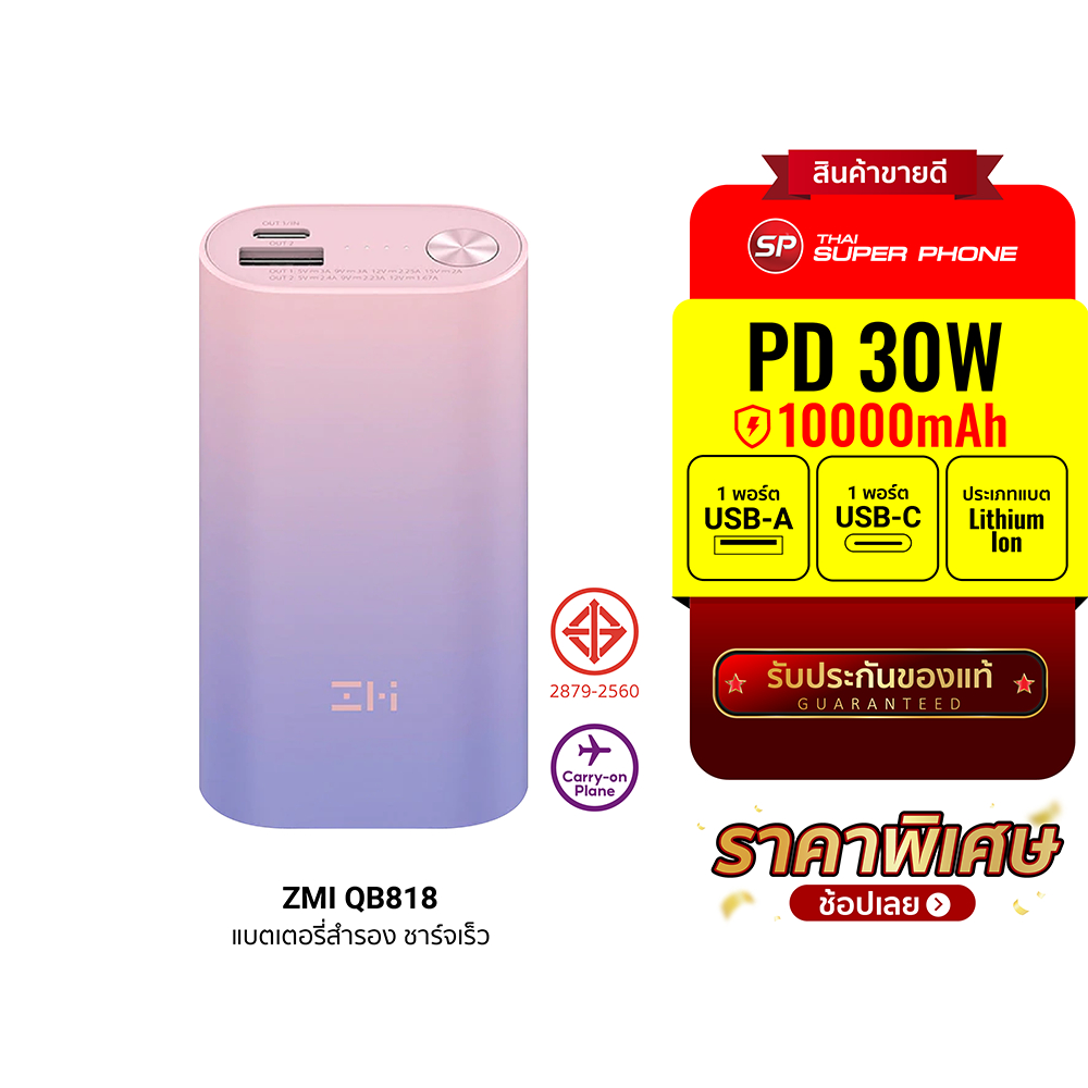 [ราคาพิเศษ] ZMI QB818 แบตสำรอง ชาร์จเร็ว PD30W 10000mAh 2 พอร์ตชาร์จ USB-A / ใช้สำหรับ Phone -1Y |