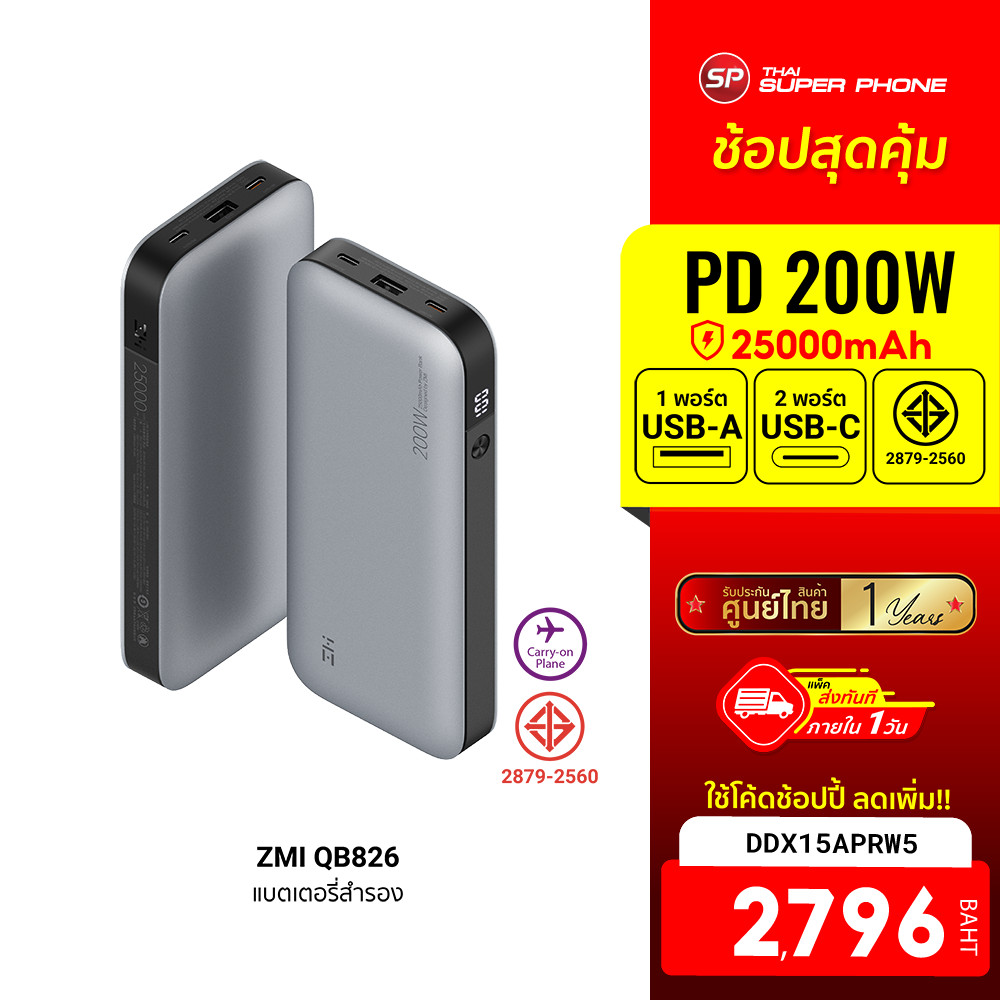 [2796 บ. โค้ด DDX15APRW5] ZMI QB826 แบตสำรอง 200W ความจุ 25000mAh ชาร์จไวเข้า-ออก ได้มาตรฐานความปลอดภัย -1Y |