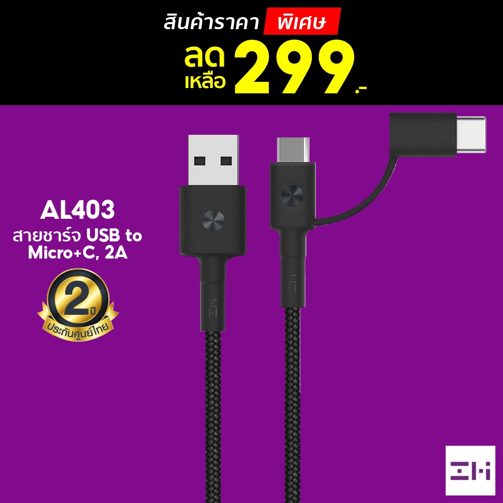 [ราคาพิเศษ 299บ.] ZMI AL403 สายชาร์จ Premium 2-in-1 Type-C + Micro สายถัก 16ชั้น ยาว 1ม. ทนทานชาร์จไว-2Y |