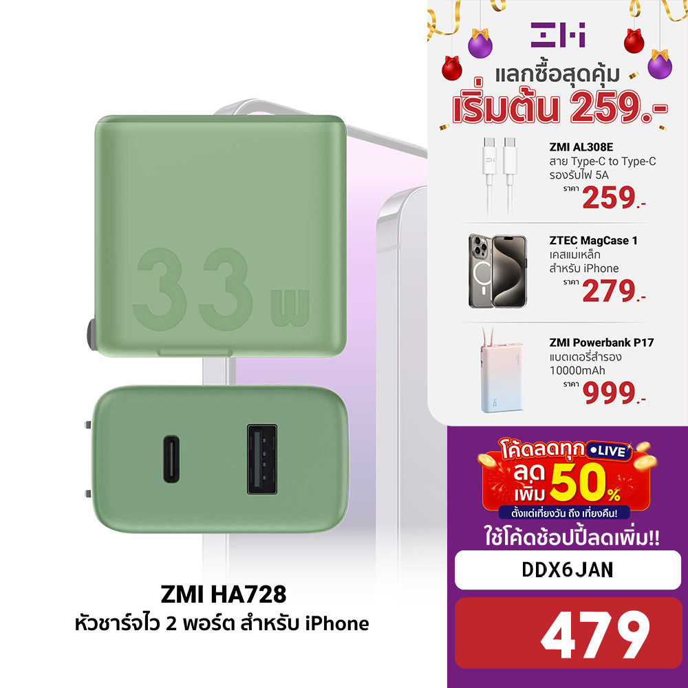 [479บ.โค้ดDDX6JAN] ZMI HA728 Adapter 33W หัวชาร์จ 2 พอร์ต ชาร์จไว iPhone Samsung พร้อมส่ง -2Y |
