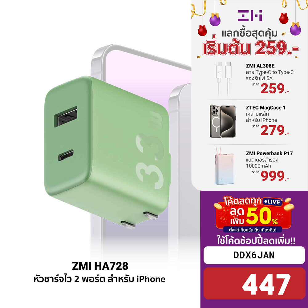 [447บ.โค้ดDDX6JAN] ZMI HA728 Adapter 33W หัวชาร์จ 2 พอร์ต ชาร์จไว iPhone -2Y |
