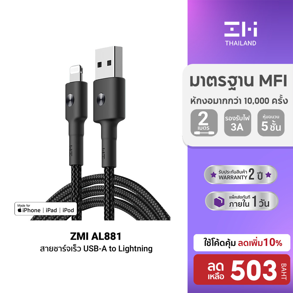 [ลดเหลือ 503] ZMI AL881 สายชาร์จเร็ว หุ้มไนล่อนถัก USB-A to Lightning 2 เมตร -2Y |