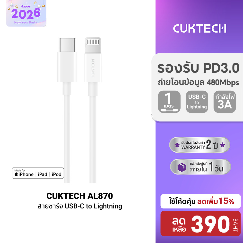 [ลดเหลือ 390] CUKTECH AL870 / CL315P / ZMI AL856 สายชาร์จ Type C to Lightning รองรับชาร์จไวสำหรับ iPhone 11 - 13 MFI -2Y |